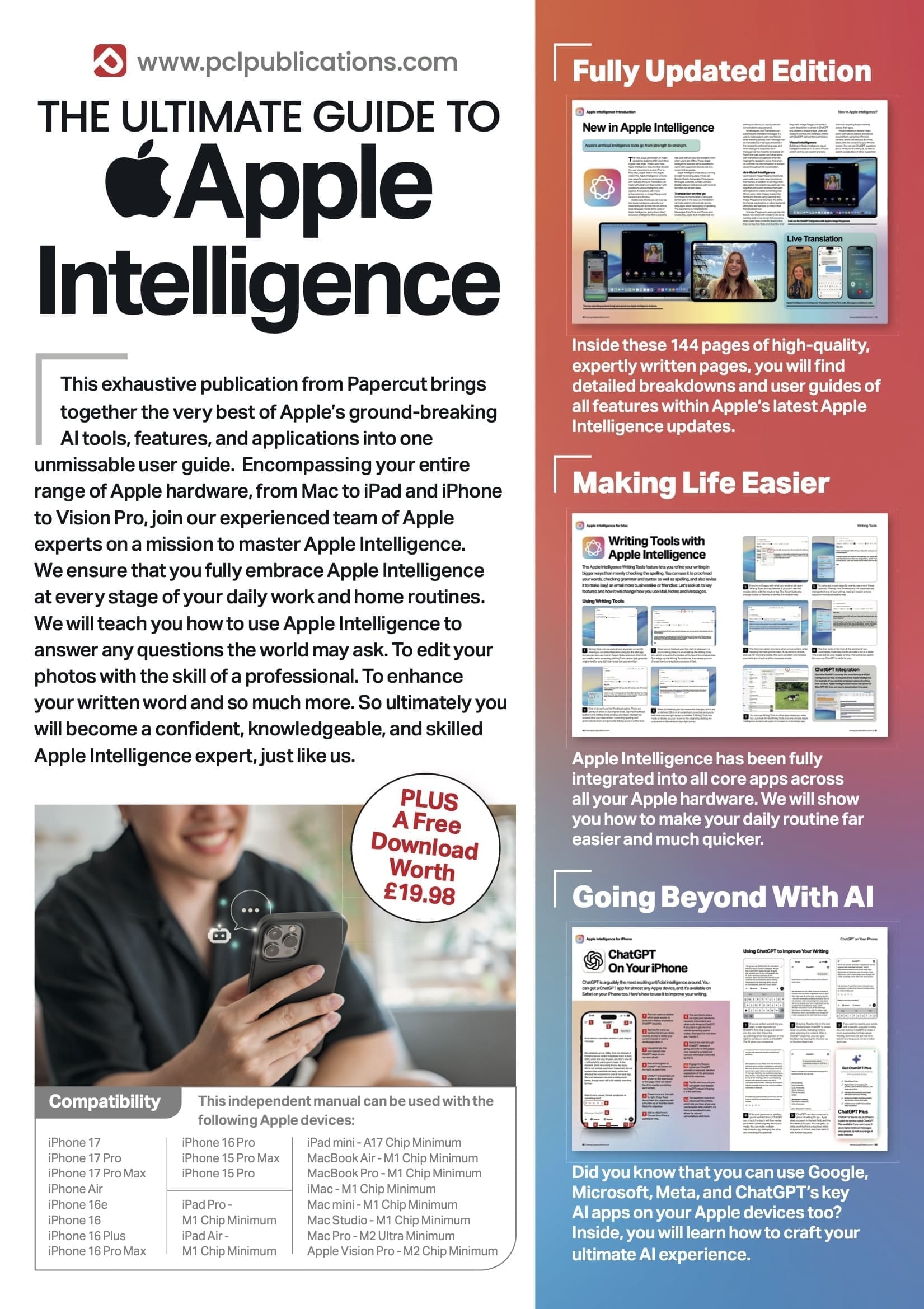 This exhaustive publication from Papercut brings together the very best of Apple’s ground-breaking AI tools, features, and applications into one unmissable user guide. Encompassing your entire range of Apple hardware, from Mac to iPad and iPhone to Vision Pro, join our experienced team of Apple experts on a mission to master Apple Intelligence. We ensure that you fully embrace Apple Intelligence at every stage of your daily work and home routines. We will teach you how to use Apple Intelligence to answer any questions the world may ask. To edit your photos with the skill of a professional. To enhance your written word and so much more. So ultimately you will become a confident, knowledgeable, and skilled Apple Intelligence expert, just like us.